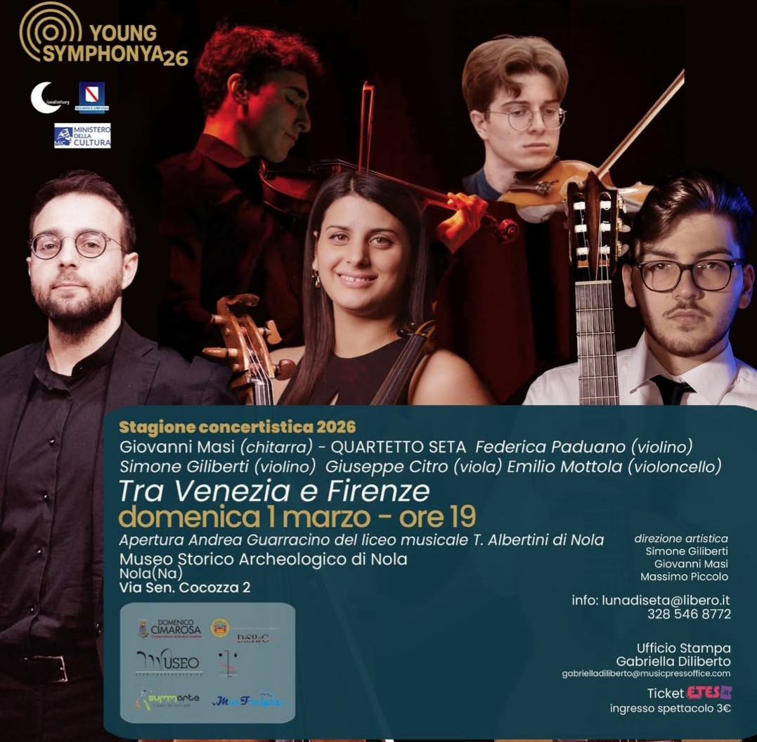 Prenderà ufficialmente il via domani, domenica 1° marzo 2026, alle ore 19.00, presso il Museo Storico Archeologico di Nola, la Stagione Cameristica Luna di Seta 2026 “Young Symphonya”, promossa dall’Associazione Luna di Seta sotto la direzione artistica di Simone Giliberti, Giovanni Masi e Massimo Piccolo. La rassegna si propone come un percorso musicale articolato e coinvolgente, capace di attraversare epoche, stili e linguaggi, rendendo omaggio alla grande tradizione classica italiana, alla scuola napoletana, alla musica d’autore del Novecento, fino alle suggestioni iberiche e latino-americane, con particolare attenzione alla dimensione della danza come elemento espressivo universale.