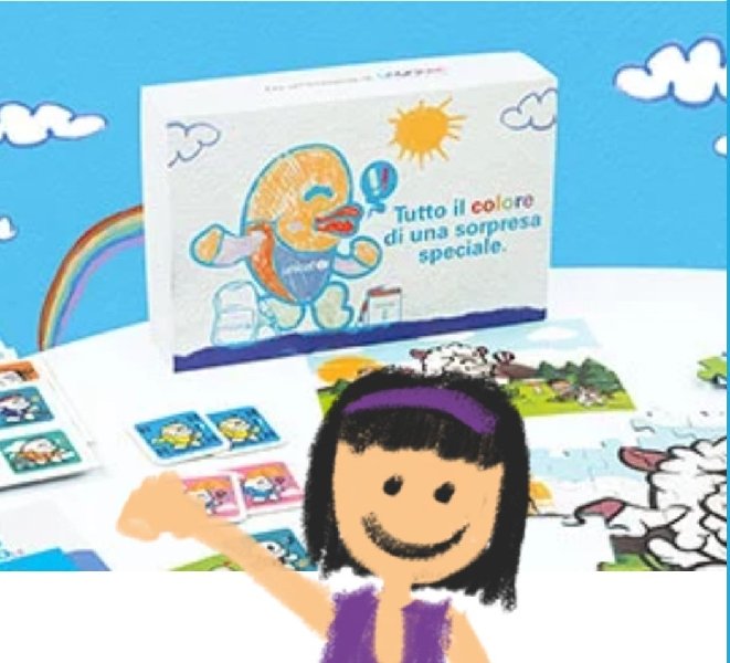 Ogni cofanetto, realizzato con materiali di riciclo, contiene: pennarelli, un activity book, un puzzle e un gioco memo.